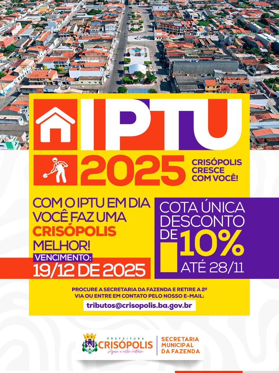 O vencimento do IPTU 2025 será em 19 de dezembro. Caso não tenha recebido o carnê, procure a Secretaria da Fazenda e retire sua 2ª via ou solicite pelo e-mail tributos@crisopolis.ba.gov.br